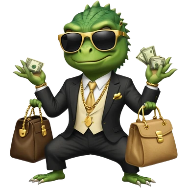 capitalist iguana banker godfather with black sunglasses breakdance with bag emoji