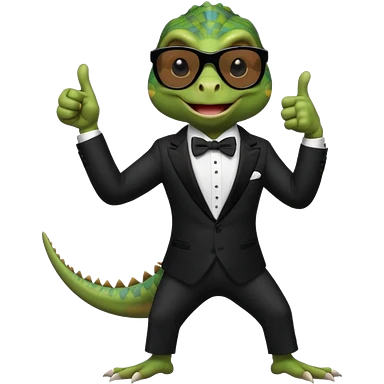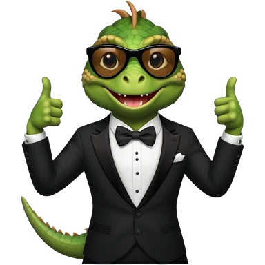 capitalist iguana banker in tuxedo and black sunglasses dancing crazy thumb up emoji