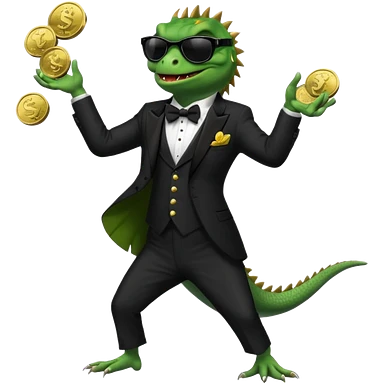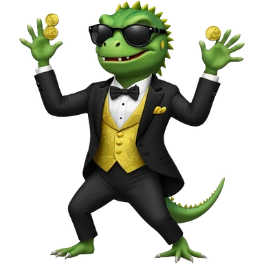 capitalist iguana banker in tuxedo and black sunglasses dancing crazy with coins emoji