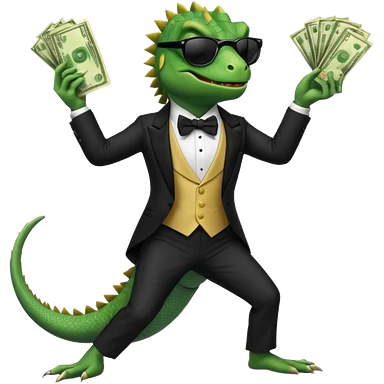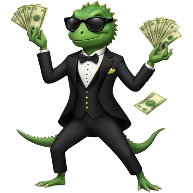 capitalist iguana banker in tuxedo and black sunglasses dancing crazy with money emoji