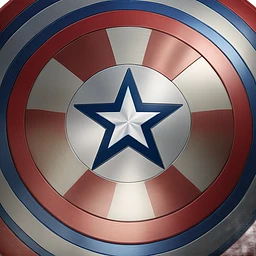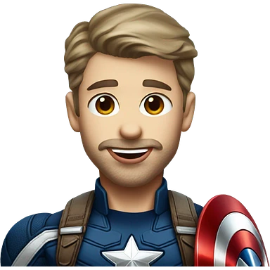 Highly detailed, hyper-realistic emoji of Captain America. He wears his iconic blue suit with a white star on his chest, a red-and-white striped torso, and an ‘A’ helmet. He holds his circular red, white, and blue shield. Minimalist background for focus. emoji