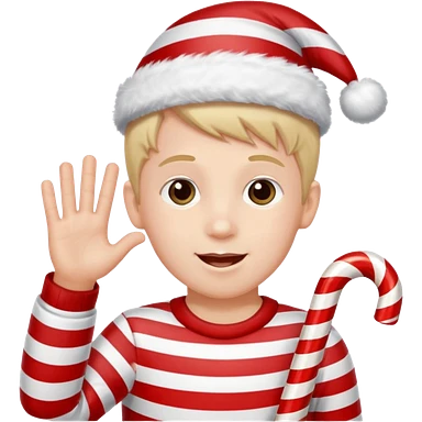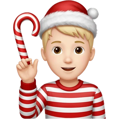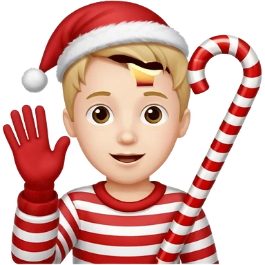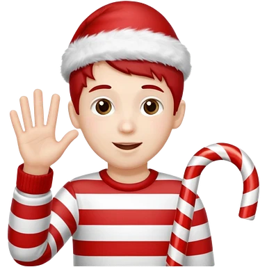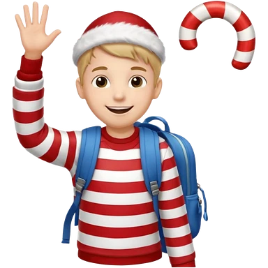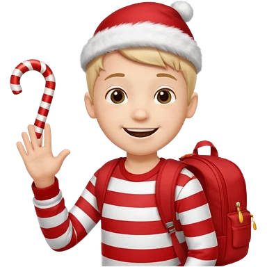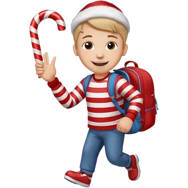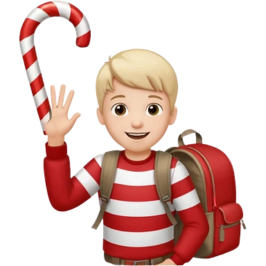 A boy waving a candy cane happily, backpack bouncing as he moves. emoji