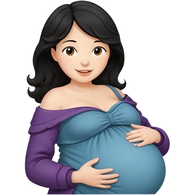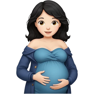 pregnant woman with wavy black hair happily touching her big belly while wearing warm clothes and a thin coat slightly drop of her shoulder emoji