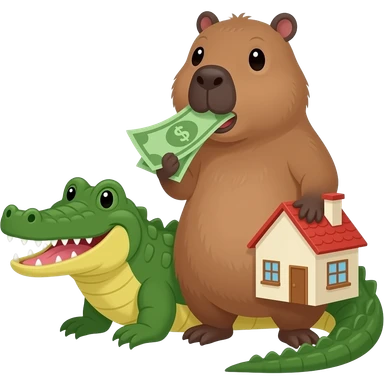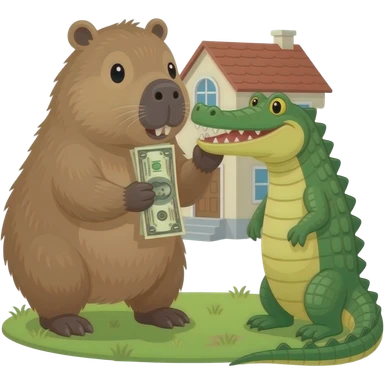 Capybara biting the tail of a crocodile than using a a 2 dollar bill to buy a house and have a family with crocodile emoji
