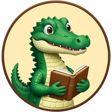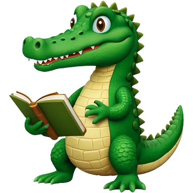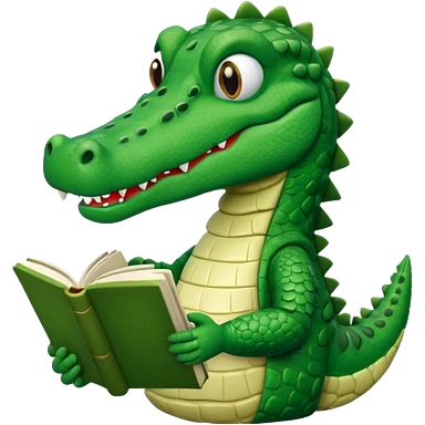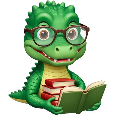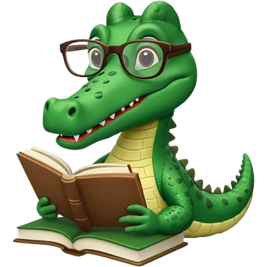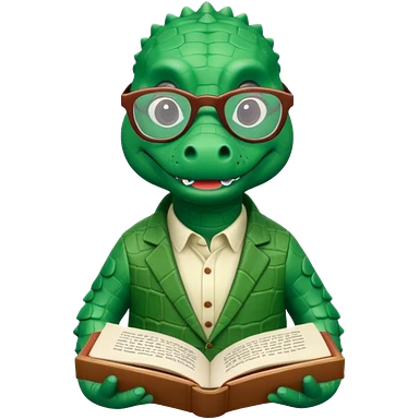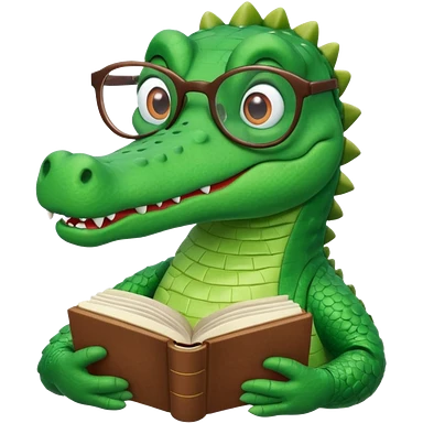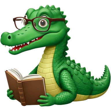 A claymation alligator with a book and glasses. The background is a solid white circle emoji