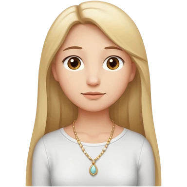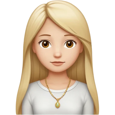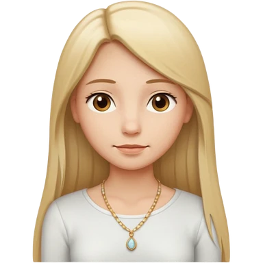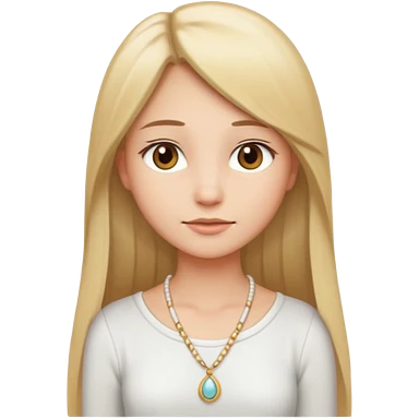 "Cartoon emoji of a girl with long, straight blonde hair, fair skin, soft brown eyes. Wearing a white top with a delicate necklace, serene expression, calm and peaceful. Smooth, simple, stylized." emoji