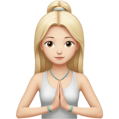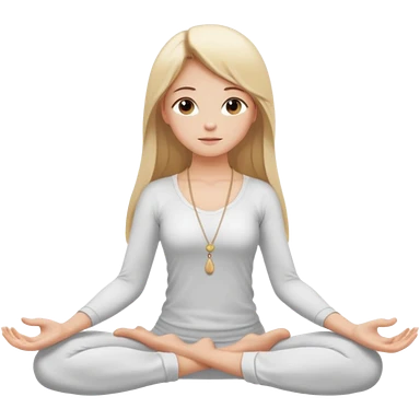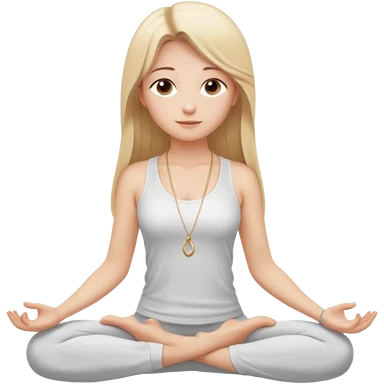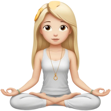 "Cartoon emoji of a girl with long, straight blonde hair, fair skin, soft brown eyes. Wearing a white top with a delicate necklace, serene expression, calm and peaceful. Smooth, simple, stylized." she is doing yoga emoji