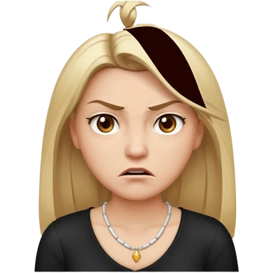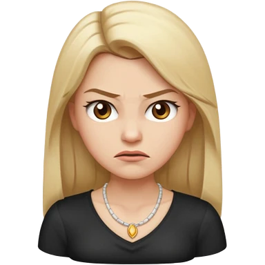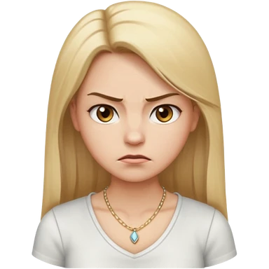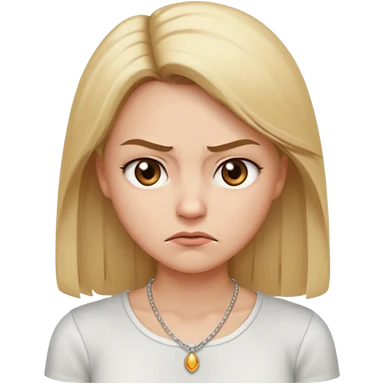 Cartoon emoji of a girl with long, straight blonde hair, fair skin, soft brown eyes. Wearing a white top with a delicate necklace, angry facial expression, furrowed brows, slightly pursed lips. Smooth, simple, stylized. emoji