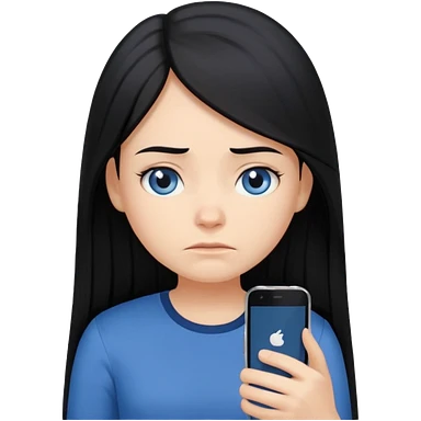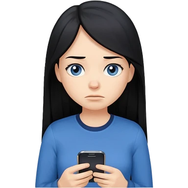 Cartoon emoji of a girl with long, straight black hair, fair skin, gentle blue eyes. Wearing a navy top, looking miserable and stressed, scrolling on her phone or watching TikTok. Smooth, simple, stylized. emoji