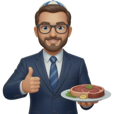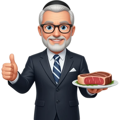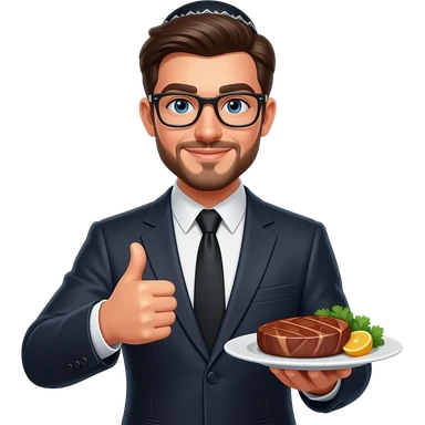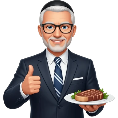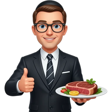 Shaven White man in nice suit with black kippa and glasses full body giving thumbs up and serving a steak emoji