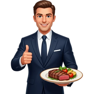 White man in nice suit full body giving thumbs up and serving a steak emoji