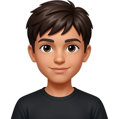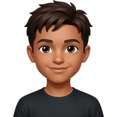 um menino de 13 anos com cara de 12, ele tem cabelo marrom escuro e pele negra, o olho dele é castanho escuro e ele está usando uma camisa preta emoji