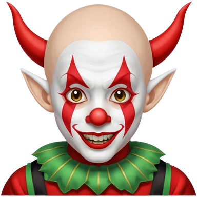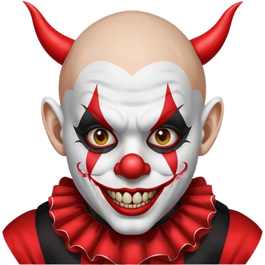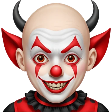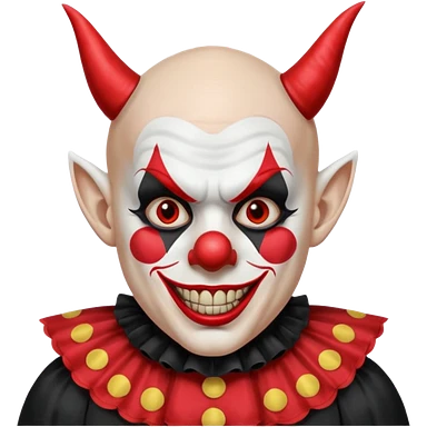 Crea un payaso que tenga toda la parte de la cara pintada de blanco que también de blanco esté la calva que no tenga pelo que tenga unas orejas como de duende, unos dientes picudos, unos cuernos de color negro y un traje de payaso rojo con negro emoji
