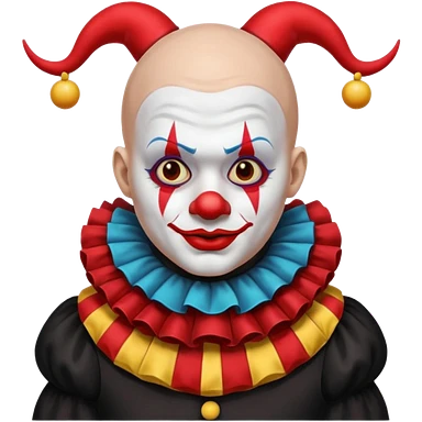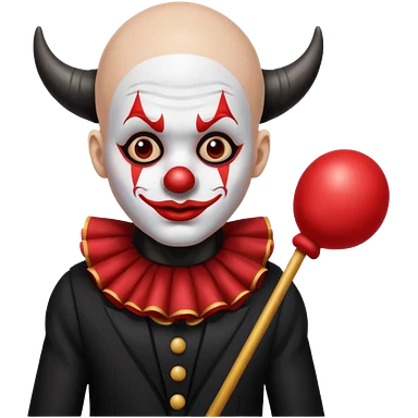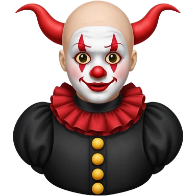 Crea un payaso con toda la cara blanca sin pelo con cuernos de color negro, que su cuerpo tenga un traje de payaso negro con rojo emoji