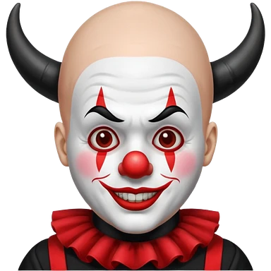 Crea un payaso que tenga toda la cara absolutamente toda la cara blanca, junto con la parte del pelo que sea blanco, pero que no tenga pelo con unos cuernos negros y que tengo un traje de payaso negro con rojo emoji
