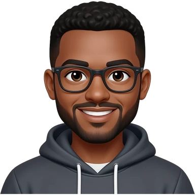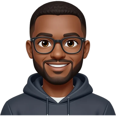 black man in his 20s with buzzcut. dark brown eyes. beard. glasses. smiling. wearing a hoodie. emoji
