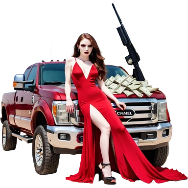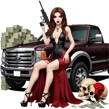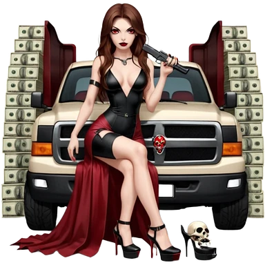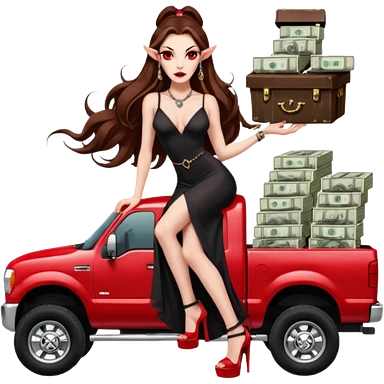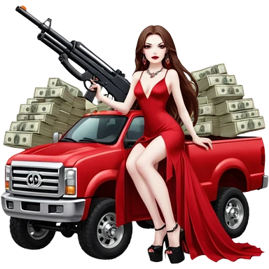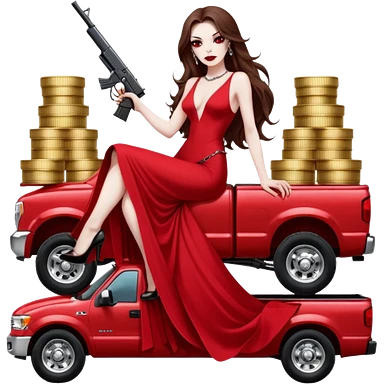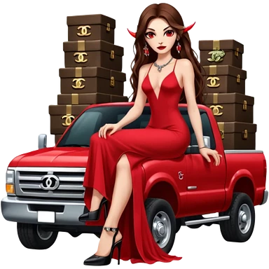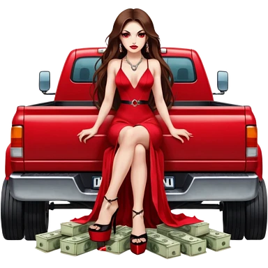 Caramel skin toned Lilith symbol seductress evil brown straight long hair haired, sexy succubus woman with red and black Chanel dress sitting on a Black and gold throne. A large black wolf laying beside he emoji | AI Emoji Generator