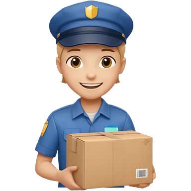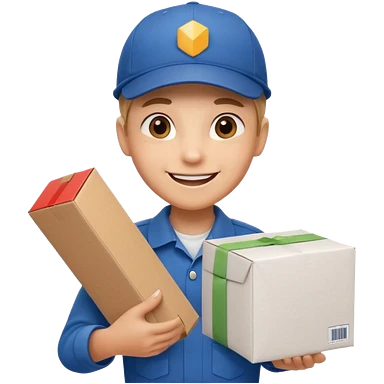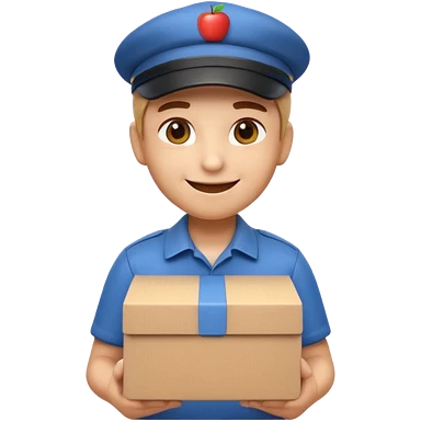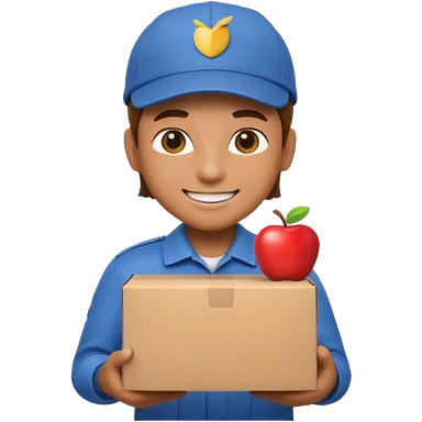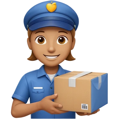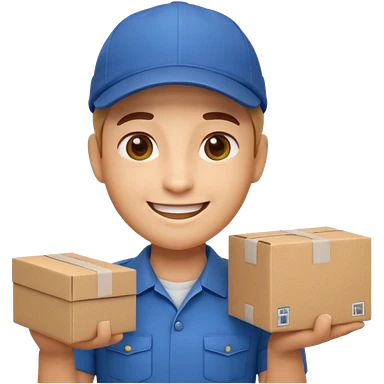 3D Apple-style emoji of a delivery worker holding a cardboard package. Wearing a cap and uniform shirt, smiling expression. Rounded, glossy, smooth, soft shadows, white background. emoji
