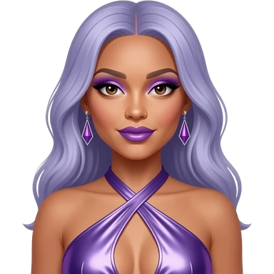 Cardi B with dark brown eyes, long black hair, periwinkle eyeshadow and lipstick, periwinkle metallic halter dress, periwinkle earrings emoji