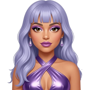 Cardi B with dark brown eyes, long periwinkle hair, periwinkle eyeshadow and lipstick, periwinkle metallic halter dress, periwinkle earrings emoji