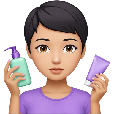 tan girl purple shirt with black hair & a pixie, doing her skin care emoji