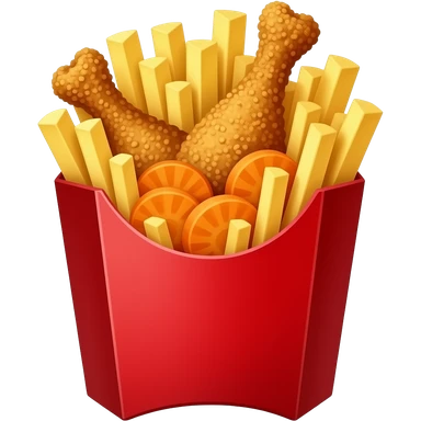 papas A LA FRANCESA en una caja roja con pedacitos de pollo frito, y zanahoria cortadas redondas, todo dentro de las papas. SIN LOGOS. LA CAJA SOLOR ROJA emoji