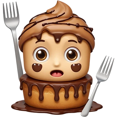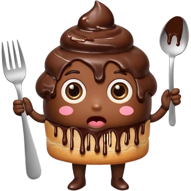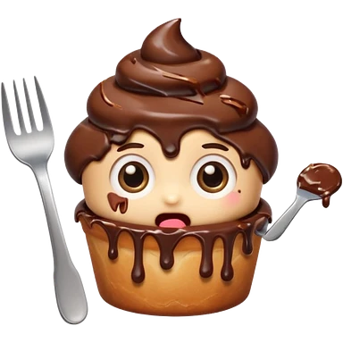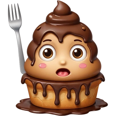 Funny cartoon chocolate mini pastry, holding tiny fork, wide shocked eyes, messy chocolate dripping, chibi style, Twitch emoji style, transparent background, colorful emoji
