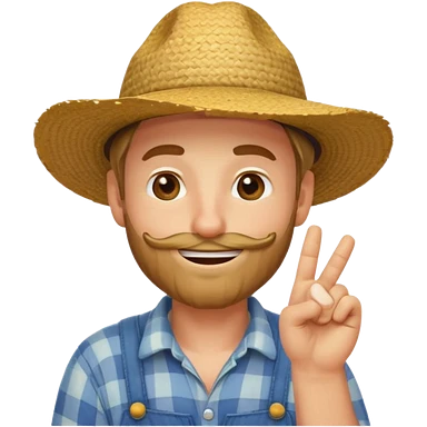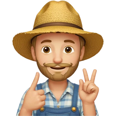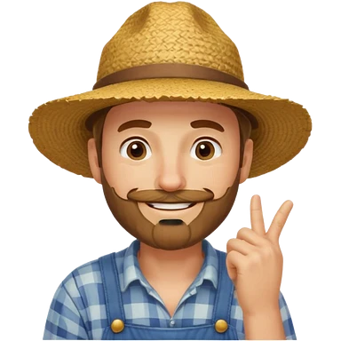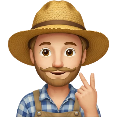 “A single emoji-style character combining 👨🌾😄 and 🤔: a smiling farmer man with a straw hat, friendly face, and light beard, holding one hand under his chin in a thinking gesture. His index finger rests under his face, eyes looking slightly upward as if thinking. emoji