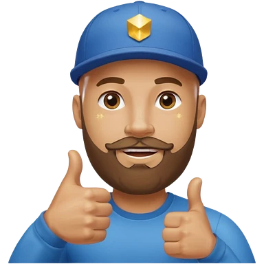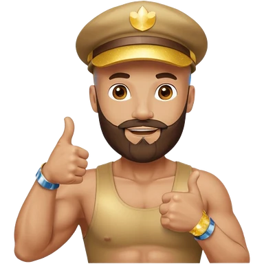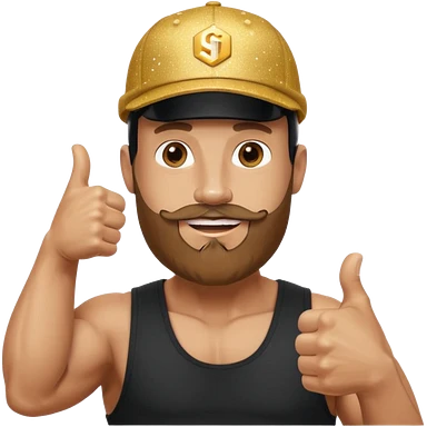 Bald bearded muscular man in cap giving thumbs up, Instagram logo, golden 500, sparkles, minimal emoji style emoji