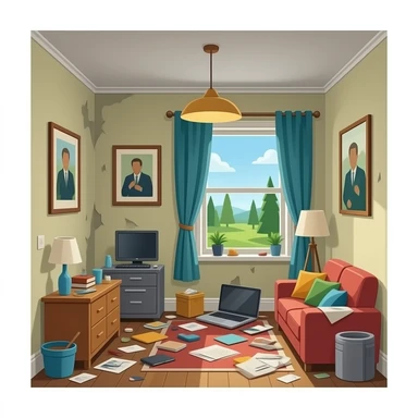 hazme una foto en el interior de una casa un poco destrozada i un poco desordenada emoji