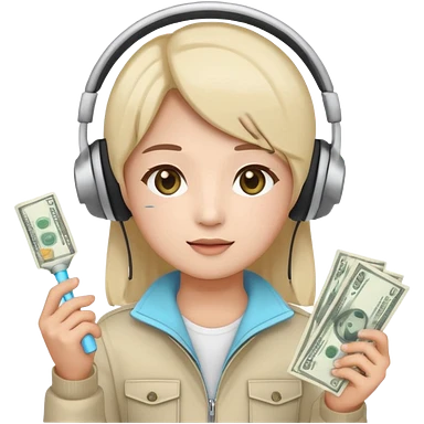 cute emoji style illustration of a K-pop fan holding a bright lightstick in one hand and cash money bills in the other hand, wearing a large headset on the head, round face, simple eyes, flat vector style, soft colors, transparent background, clean outline emoji
