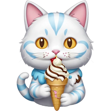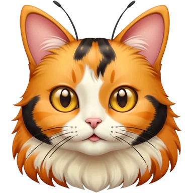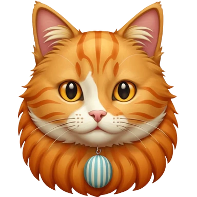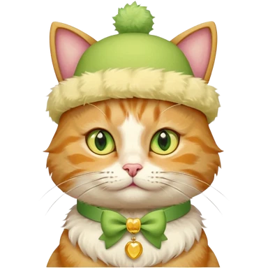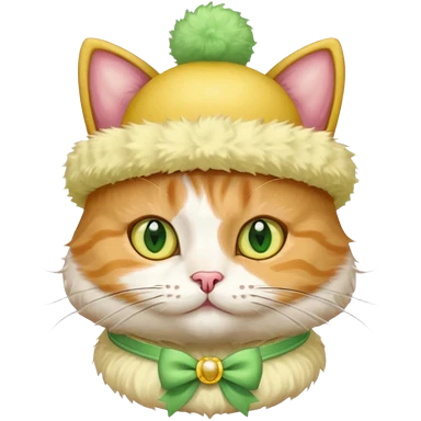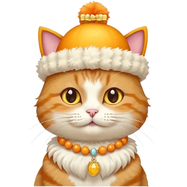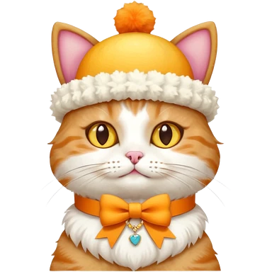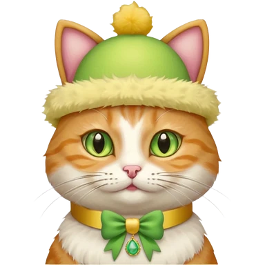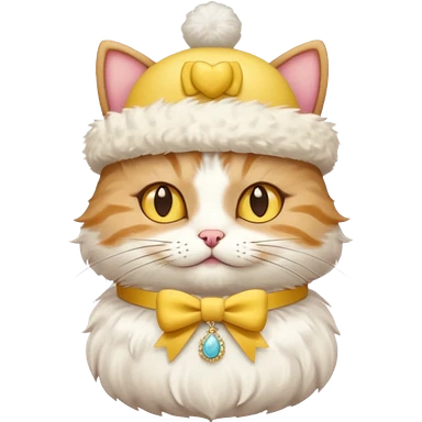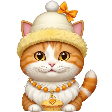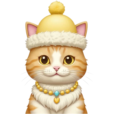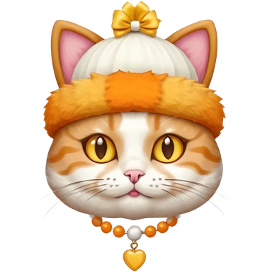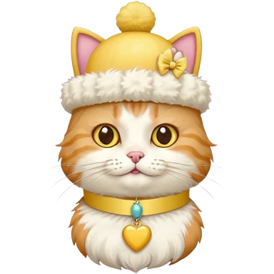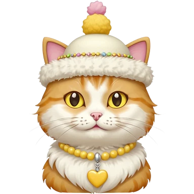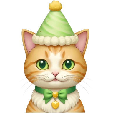 cat wearing a creamy cake hat with fun necklace around his neck and a yellow bow in the middle emoji