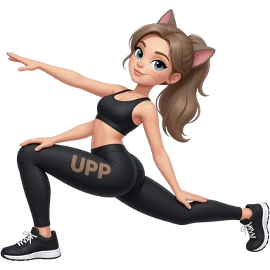 cat-cow-stretch,-fair-skinned-woman,-light-gray-blue-eyes,-ash-brown-brows,-ash-light-brown-hair-tied-back,-slim-athletic-body,-black-workout-set,-black-sneakers-with-white-soles with "UPP" written on thigh emoji
