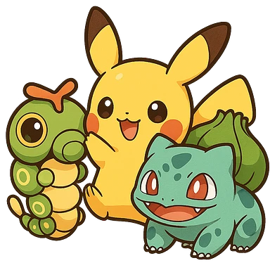 Caterpie with Pikachu and Bulbasaur, playful chibi style emoji