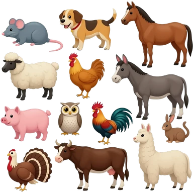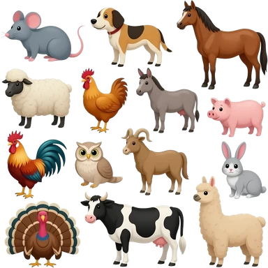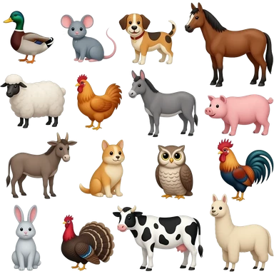 16 farm animals Duck, mouse, dog, horse, sheep, chicken, donkey, pig, goat, cat, owl, rooster, rabbit, Turkey, cow, and llama emoji
