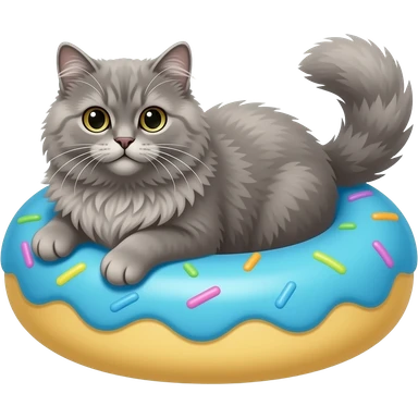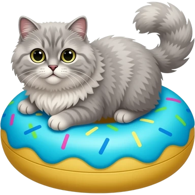 Grey Persian cat in a blue and yellow floating donut pool toy emoji