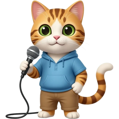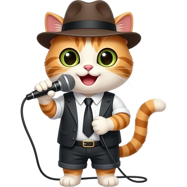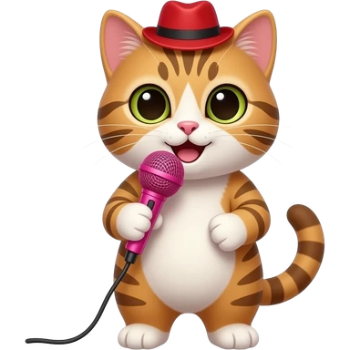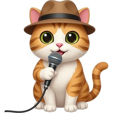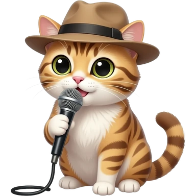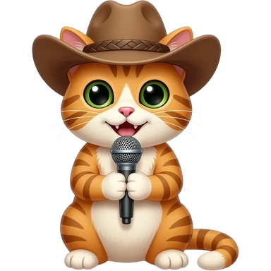 cat with cowboy hat and holding singing mic with two hands sitting pose front view emoji