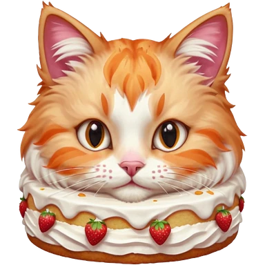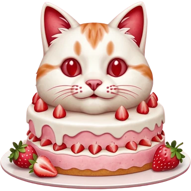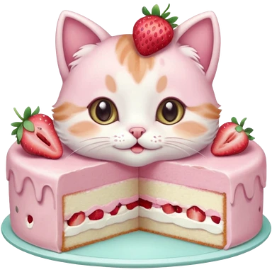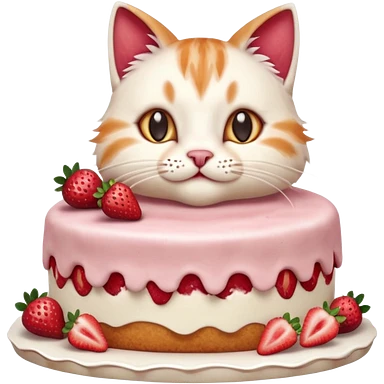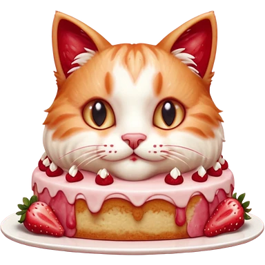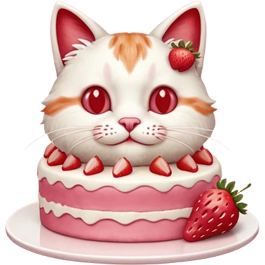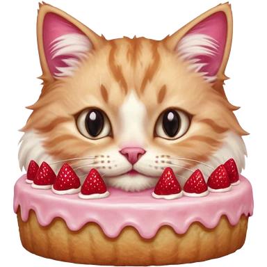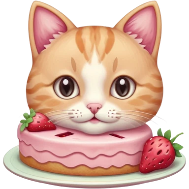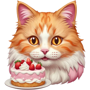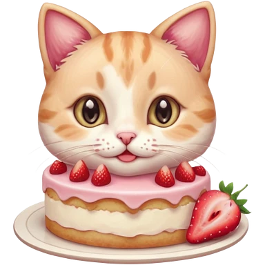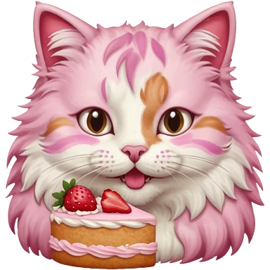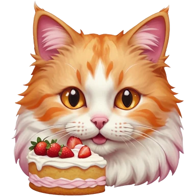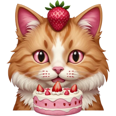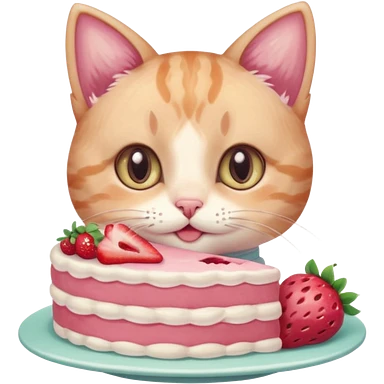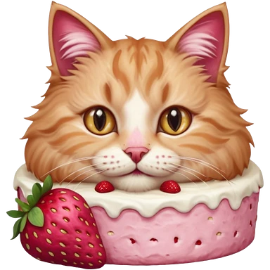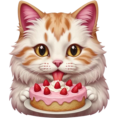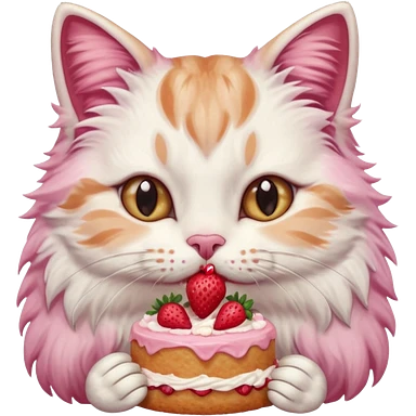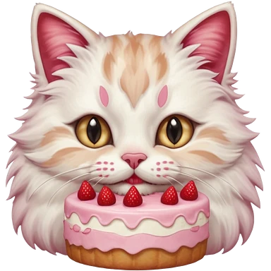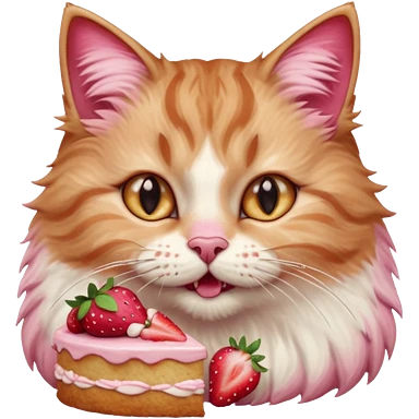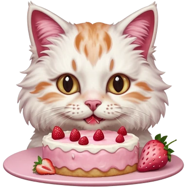 Close-up portrait of a fluffy cat eating a strawberry cake, pink cream on its nose and whiskers, detailed fur texture, soft natural light, shallow depth of field, high resolution, cute and candid moment , emoji