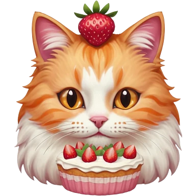 Close-up cinematic shot of a cat tasting strawberry cake, creamy frosting on its paws, dramatic soft lighting, warm tones, ultra detailed fur, shallow depth of field, professional photography style , emoji