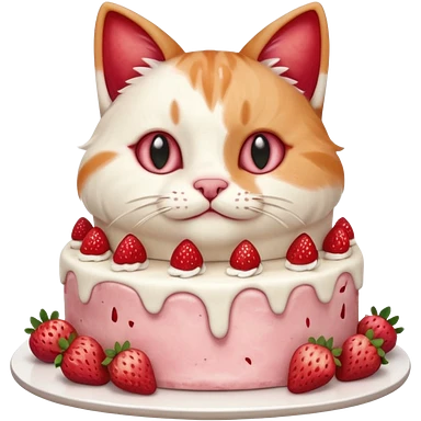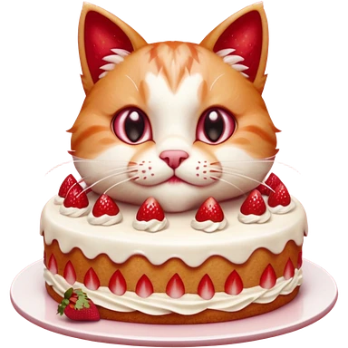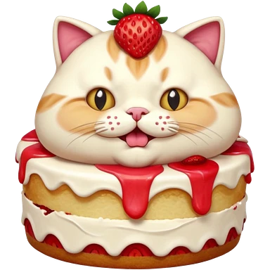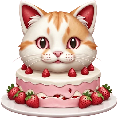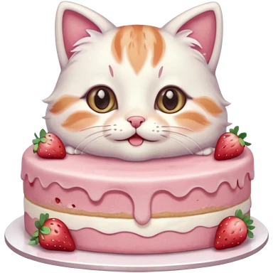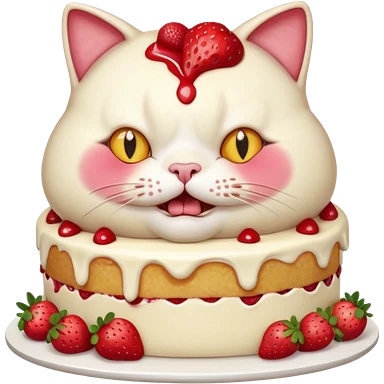 A chubby cat aggressively eating a giant strawberry cake, cream all over its face, exaggerated expression, vibrant colors, cartoon style, playful and humorous mood , emoji