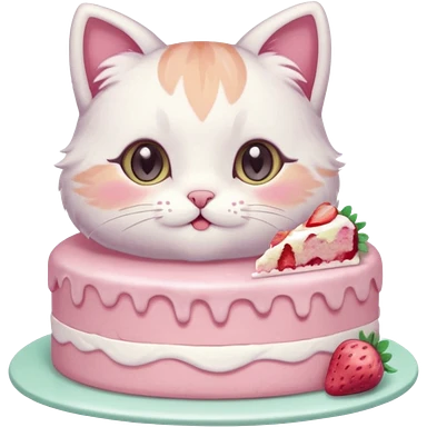 A cute cat happily eating a slice of strawberry cake, pastel color palette, soft shading, big sparkling eyes, kawaii style, highly detailed digital illustration, cozy atmosphere , emoji