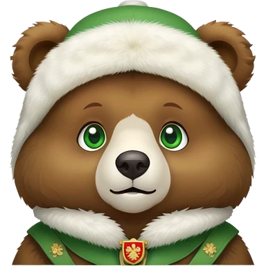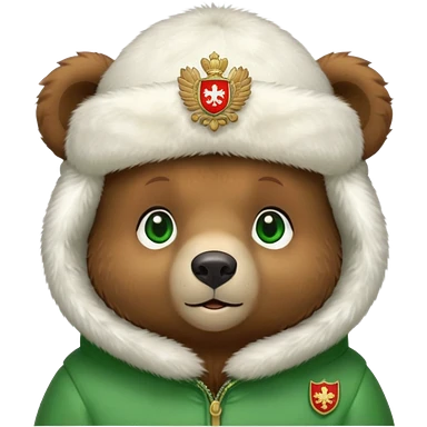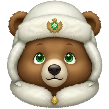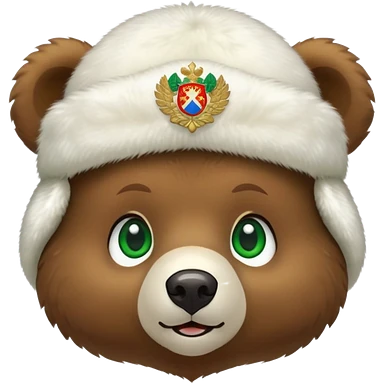 Sweet, cartoonish bear face with large green eyes, wearing white fur ushanka hat with accurate Russian Federation coat of arms centered, iOS emoji style emoji