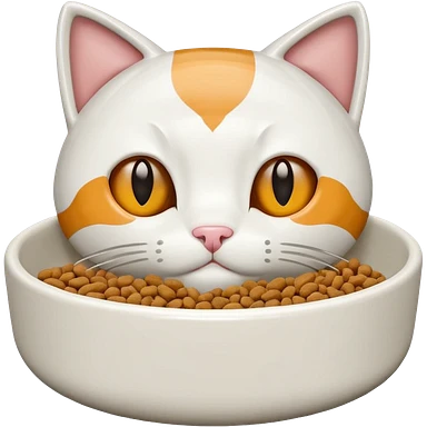 cute cat food bowl overflowing with food piled high on top, white kibble with rainbow pieces, apple emoji style emoji