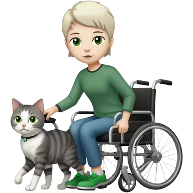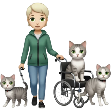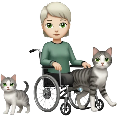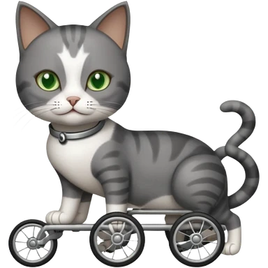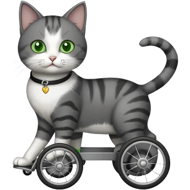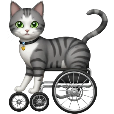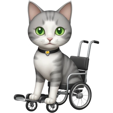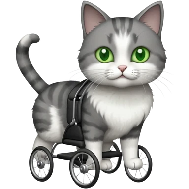 full body small short hair dark grey and white cat with green eyes walking in a wheelchair for cats emoji