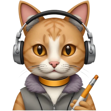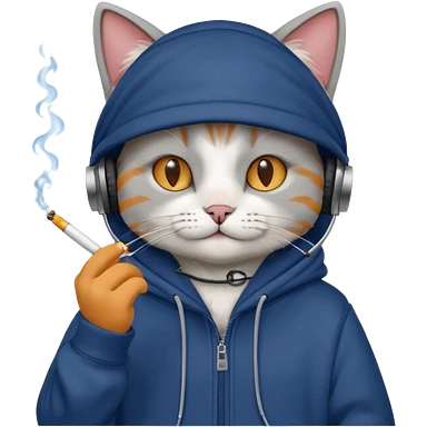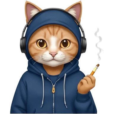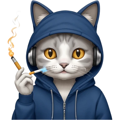 cat in headphones, in a dark-blue almost black oversized hoodie with a cigarette in his hand, more apple-like emoji emoji | AI Emoji Generator