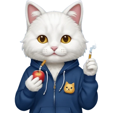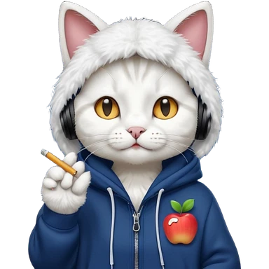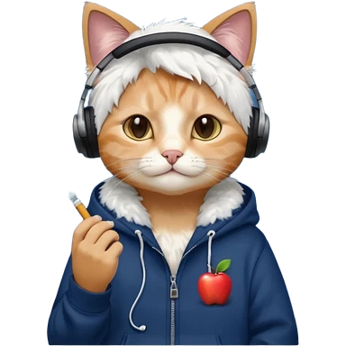 cat in headphones, in a dark-blue almost black oversized hoodie with a cigarette in his hand, more apple-like emoji