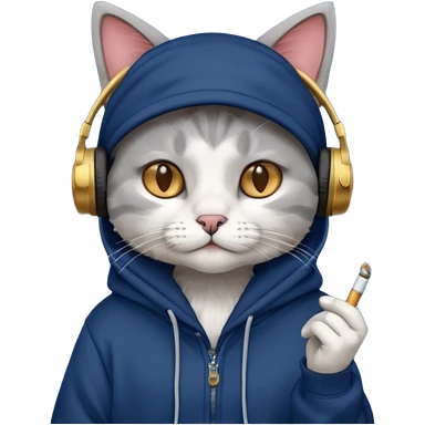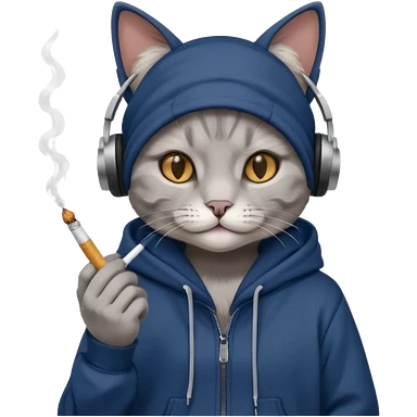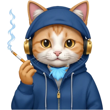 cat in headphones, in a dark-blue oversized hoodie with a cigarette in his hand emoji