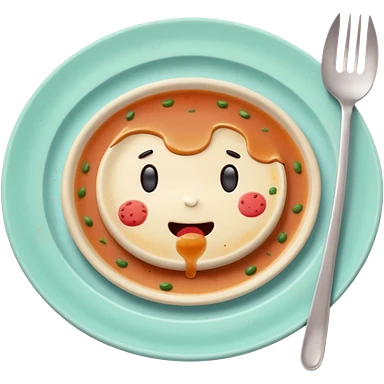 of a dirty plate after eating, leftover food scraps, sauce stains on the plate, small fork and spoon resting on the plate, slightly messy but funny, soft pastel colors, rounded shape, clean background, kawaii style, expressive and playful, high quality, emoji style emoji