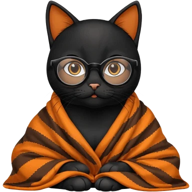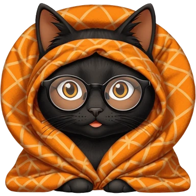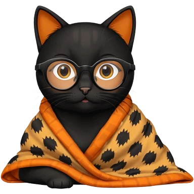 Black female cat on computer, long eyelashes, straight black hair, round glasses and she wears a blanket with an orange pattern emoji