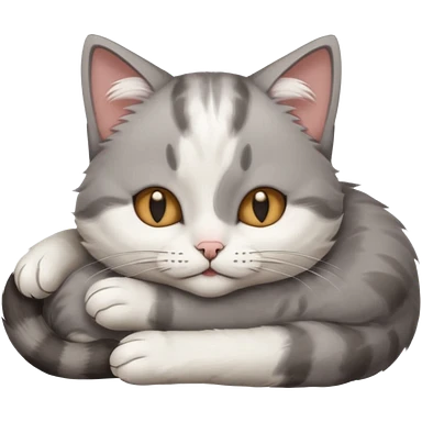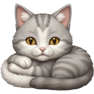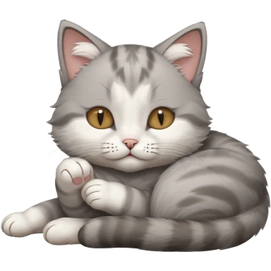 grey and white small cat with its eyes closed lying down with its paw curled and holding up his head emoji